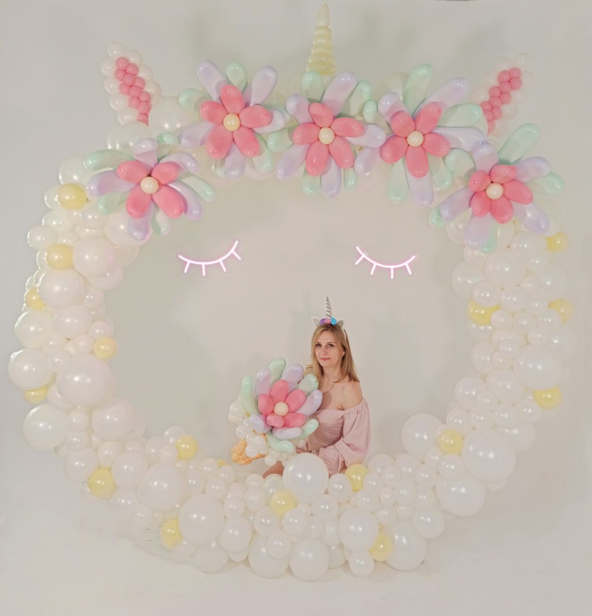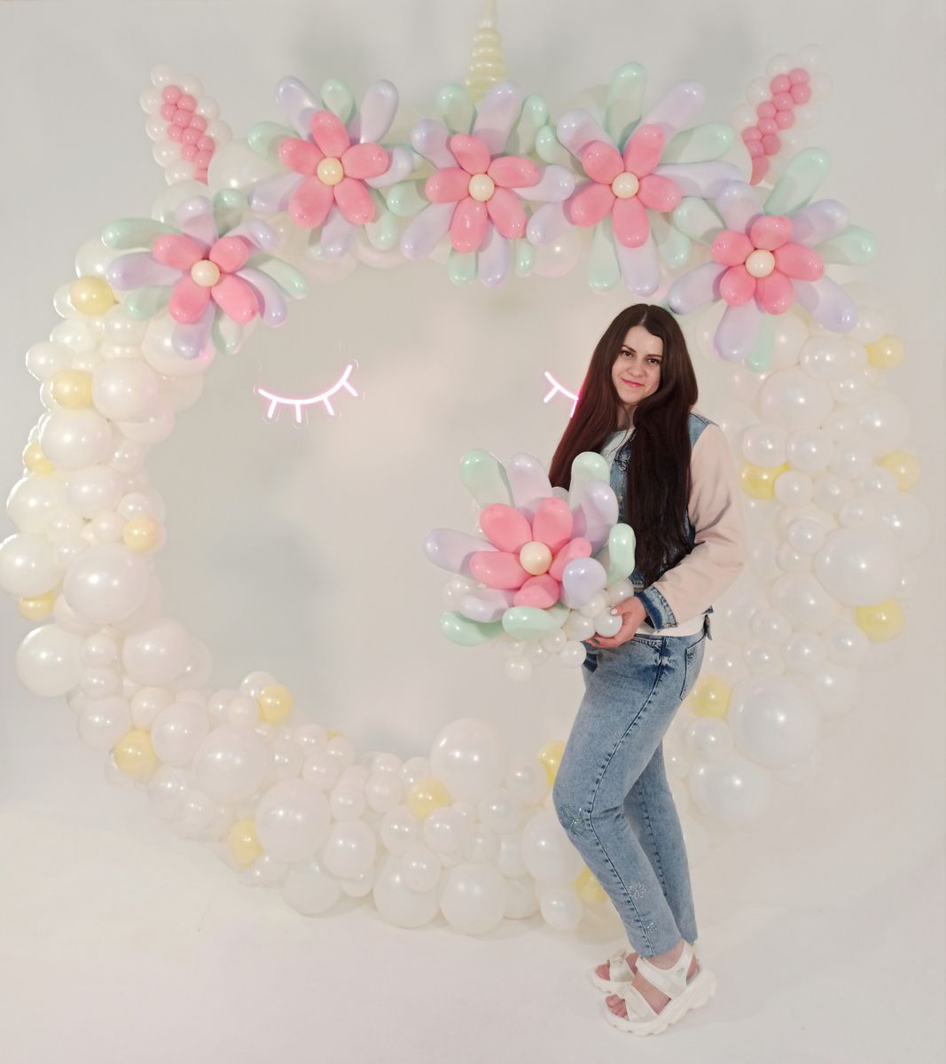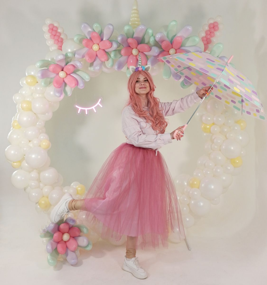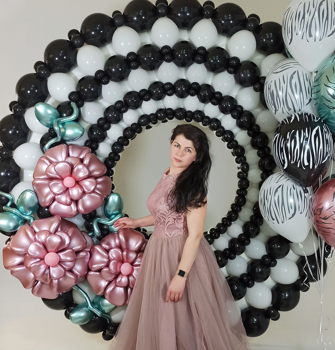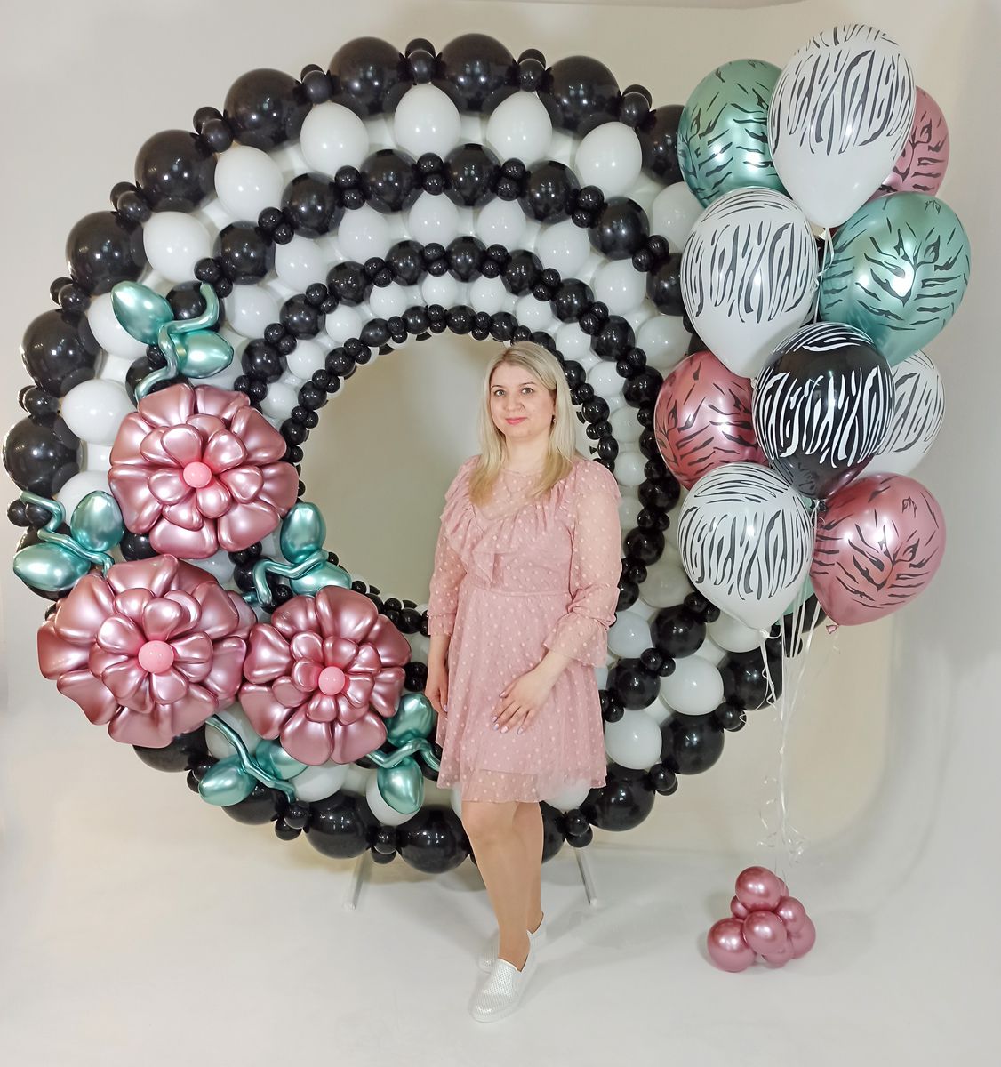 This month they included a whimsical unicorn backdrop with pastel flowers and glowing neon lights, a sophisticated black and white circle decorated with stunning flowers in Shiny Pink, and a smaller display that made use of the new Shiny Modelling balloons alongside animal prints.
