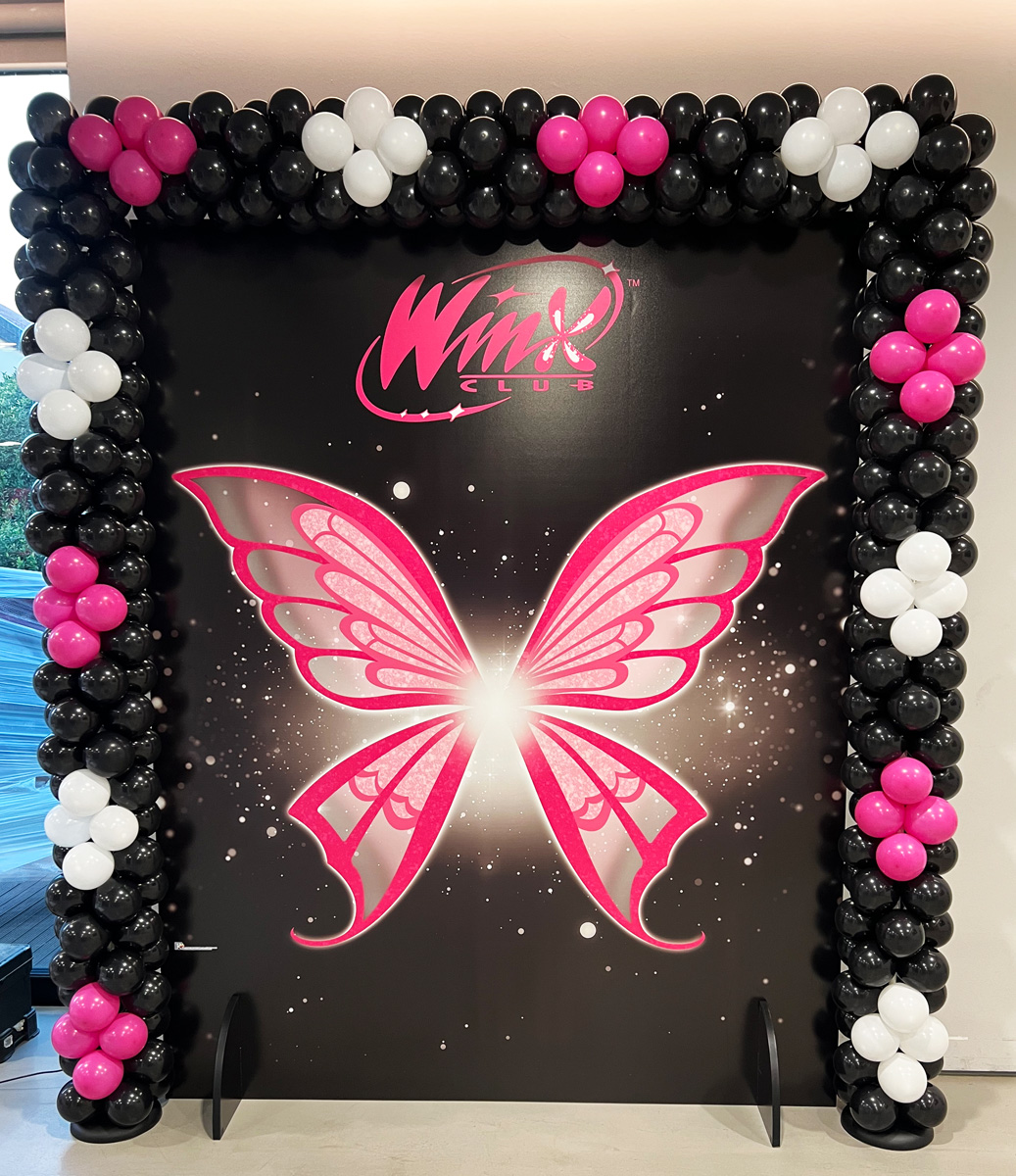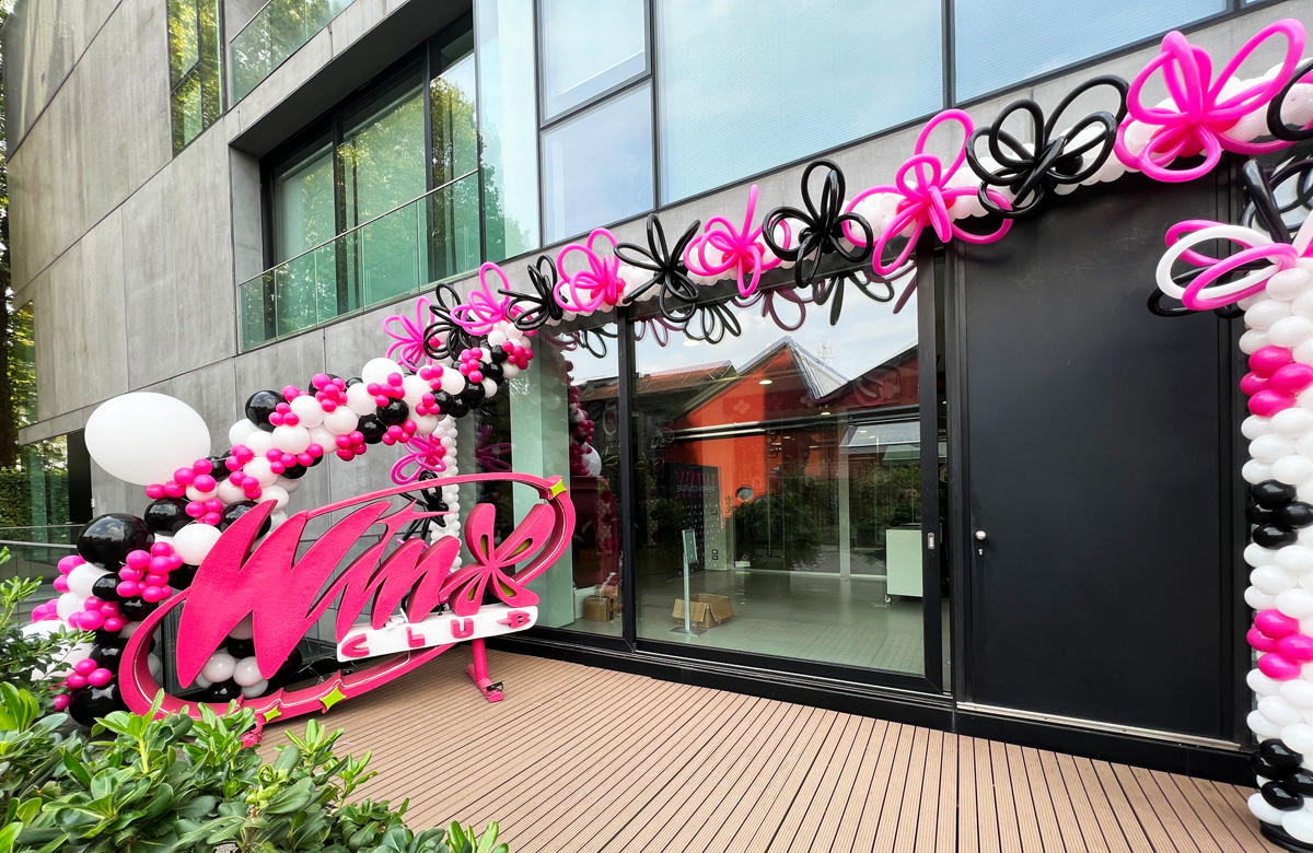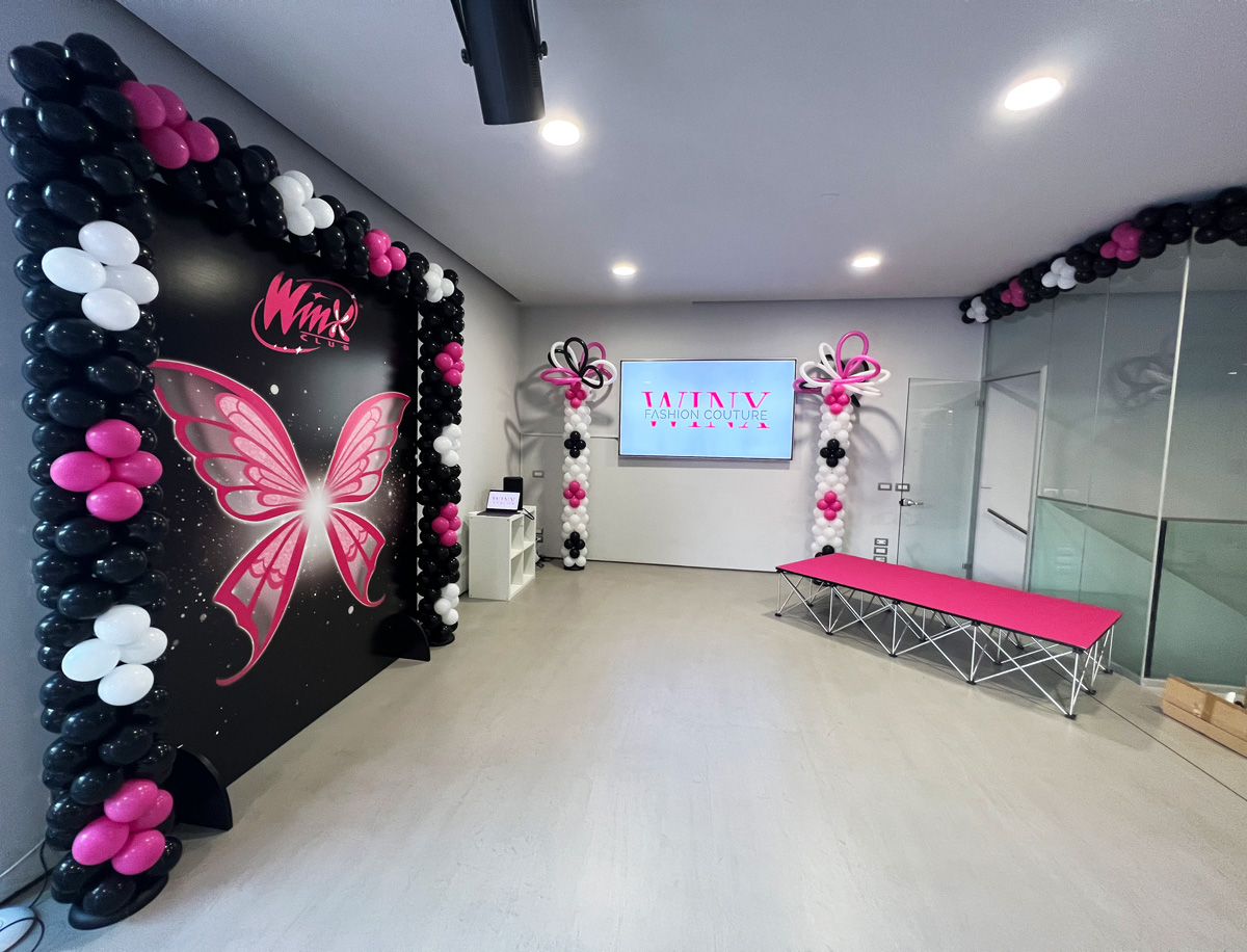 On the colorful event, at the school premises the event has been decorated with Gemar balloons using mainly Fuchsia that recalls the cartoon of the 6 fairies accompanied by black and white. The installations made by our gemar master Claudio Casagrande, were welcoming and full of energy, with shapes giving hints of magic, perfect for an event like this one, Lifting the Winx Moment.