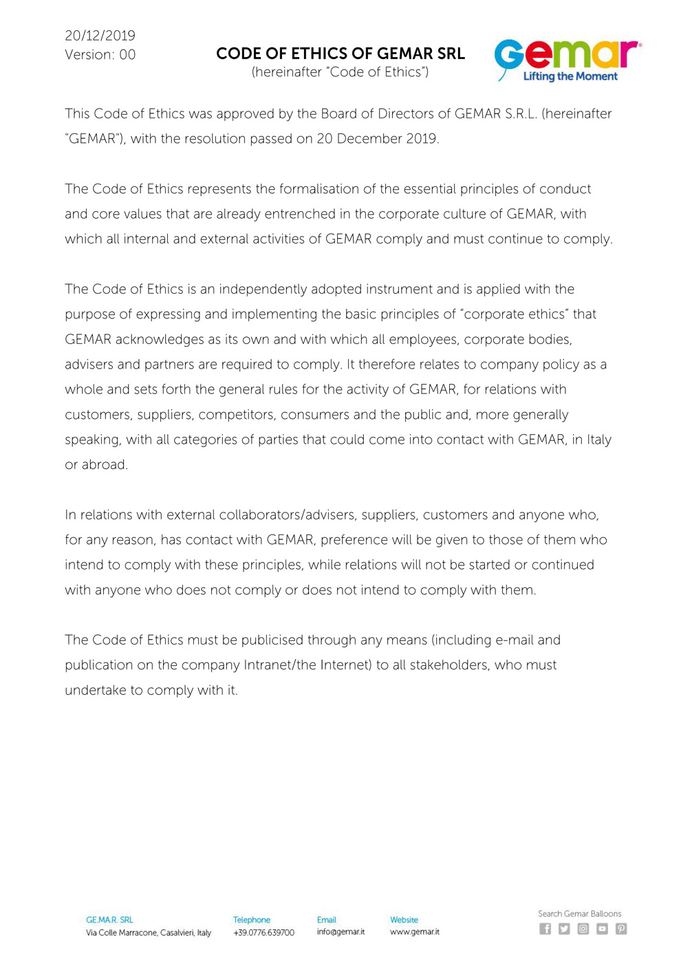 The Gemar® company is always trying to improve and every time sets itself the task of conquering new heights. After all, we want future generations to live in a world where there is more kindness and caring for nature. At the same time, we strive to act legally and safely. On this page you can view and download our current certificates, policies and other important documents.
