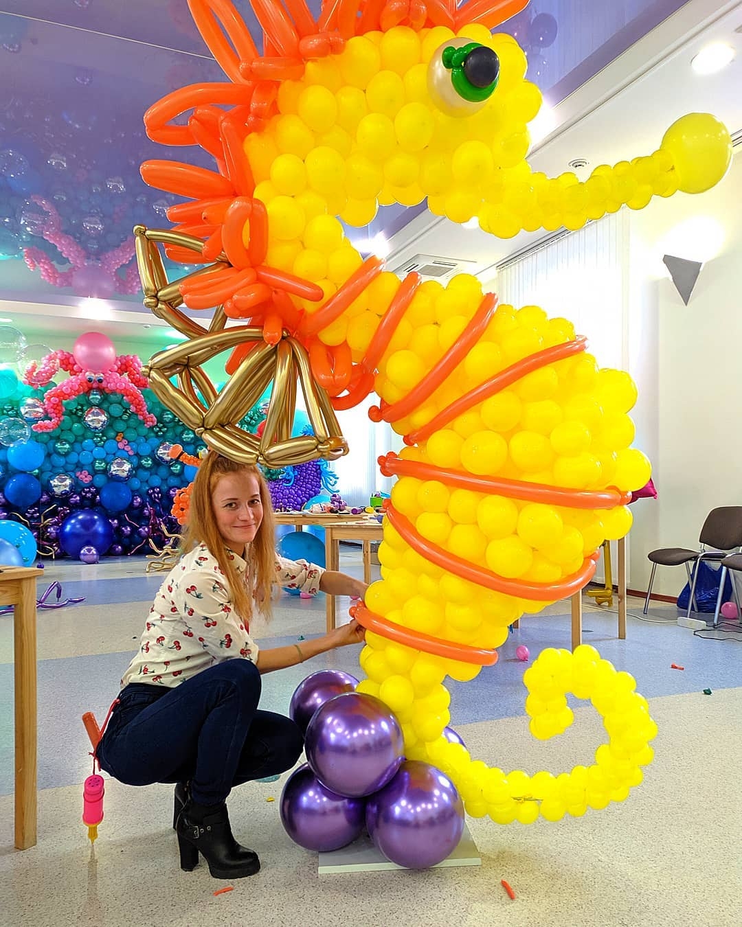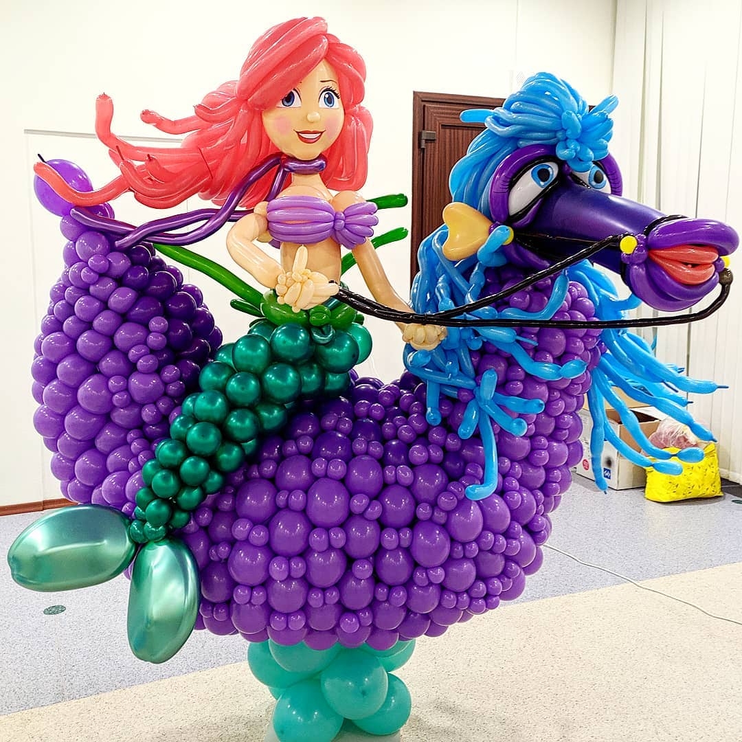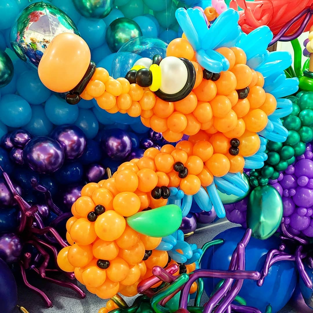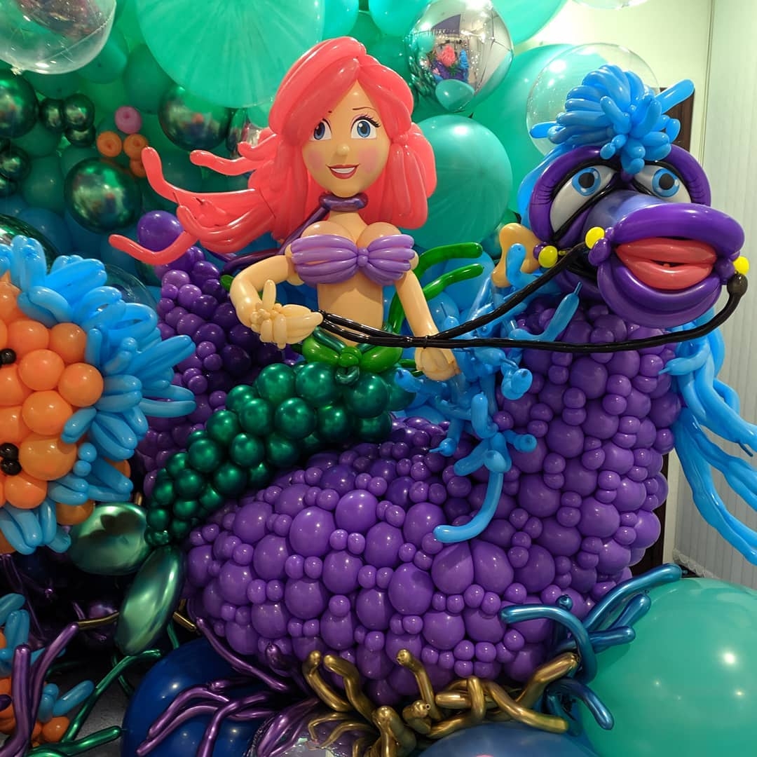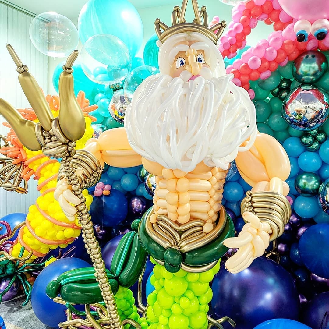 Over two days the participants worked both individually and as a team to learn new techniques and create a stunning display inspired by “The Little Mermaid.” From tiny details like crabs and small fish, to huge sculptures of Poseidon, a giant octopus and the Little Mermaid herself, this was a wonderful example of balloon art at it’s finest. The finished installation brought joy and wonder to everyone who was lucky enough to see it, taking them on an adventure to discover a new world under the sea.